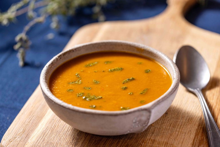 מרק עשיר מבוסס ירקות כתומים – דלעת, בטטה וגזר, עם מרקם חלק וארומה של ג'ינג'ר וחלב קוקוס.