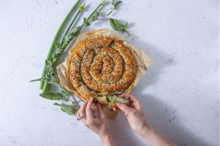 מאפה מבצק פילו, תרד טרי וגבינות. מיוצר ע"י קונדיטור יקי שגיא מקיבוץ בארי