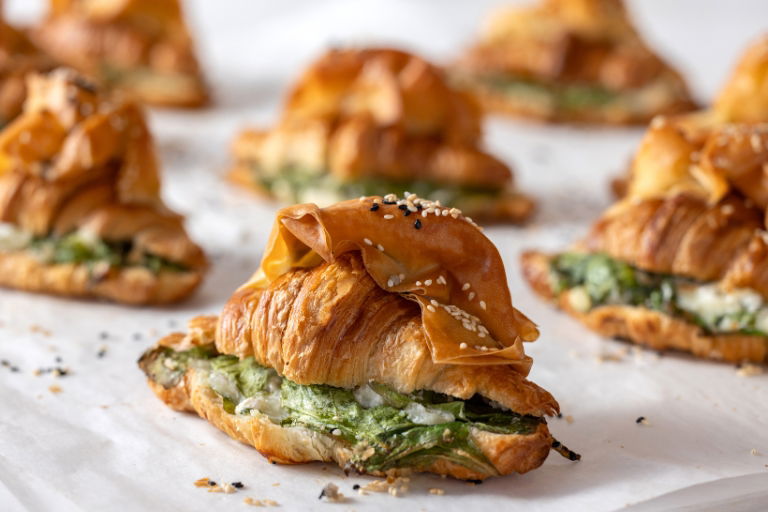 תרד טרי, תערובת גבינות, שום וכתר מבצק פילו